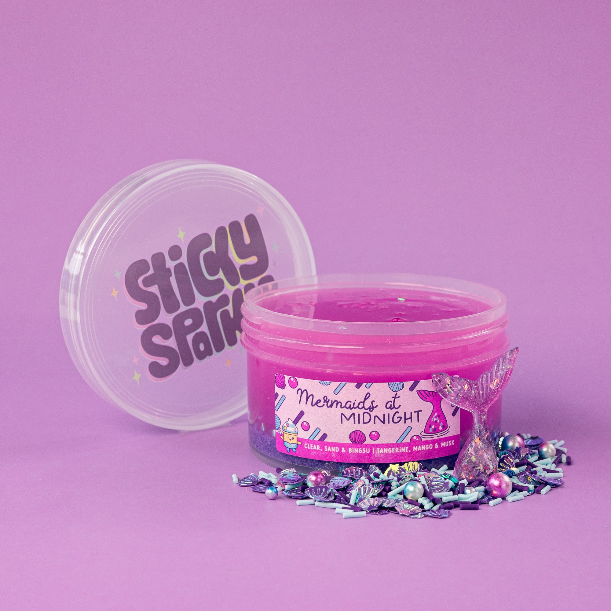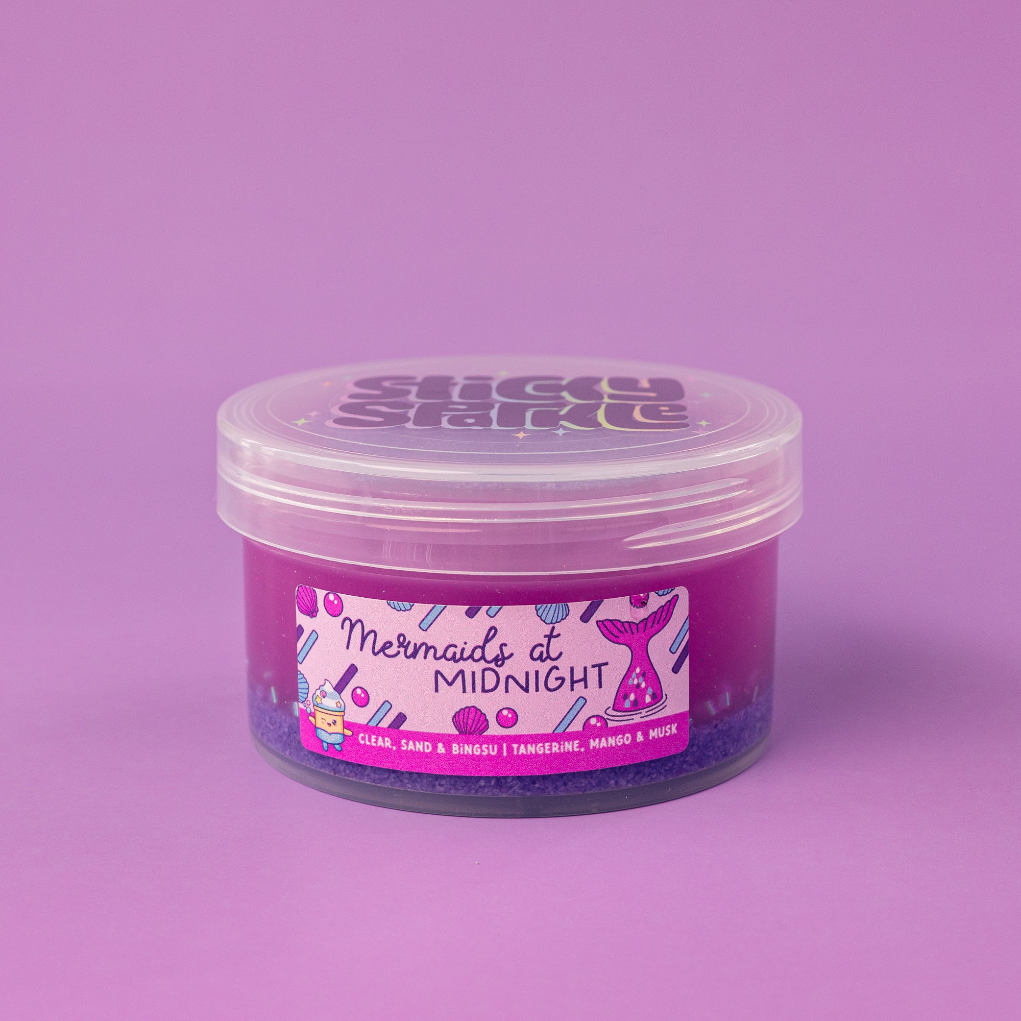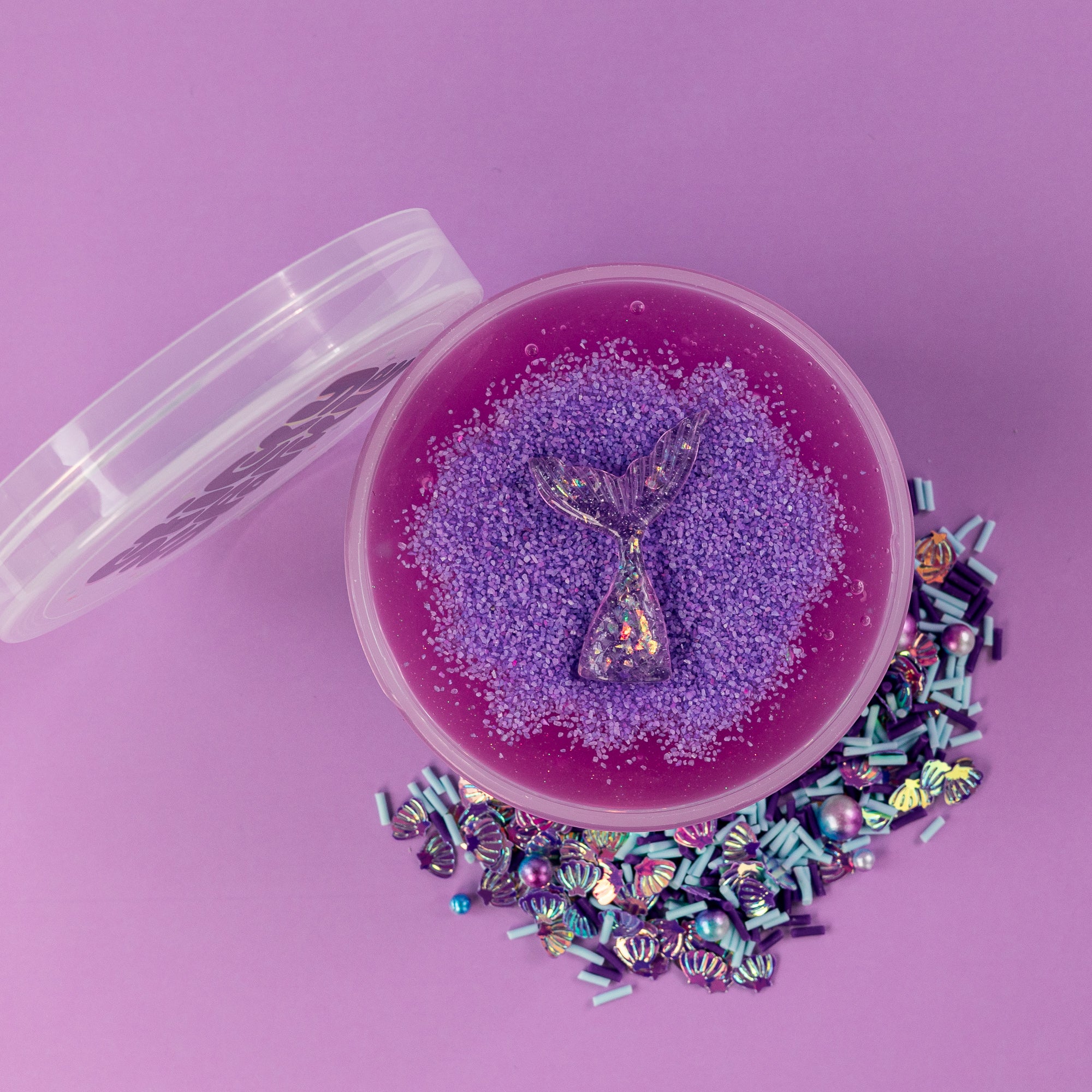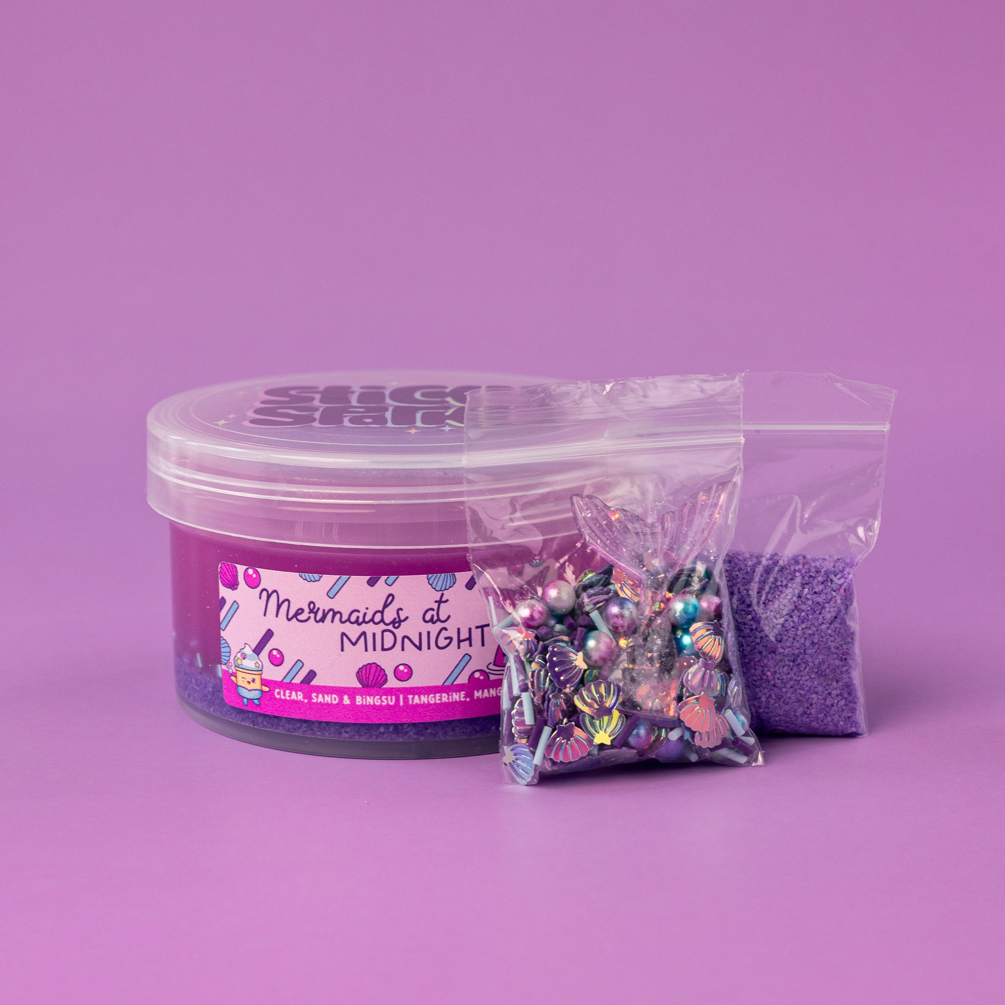 When the moon kisses the sea, the mermaids come out to play… This clear slime is infused with purple sand, bingsu beads, and a deep tropical scent of mango, tangerine, and soft musk. Beautifully vibrant and texturally addictive, it’s finished with sparkly sprinkles and a purple mermaid tail charm that’s ready to make waves.