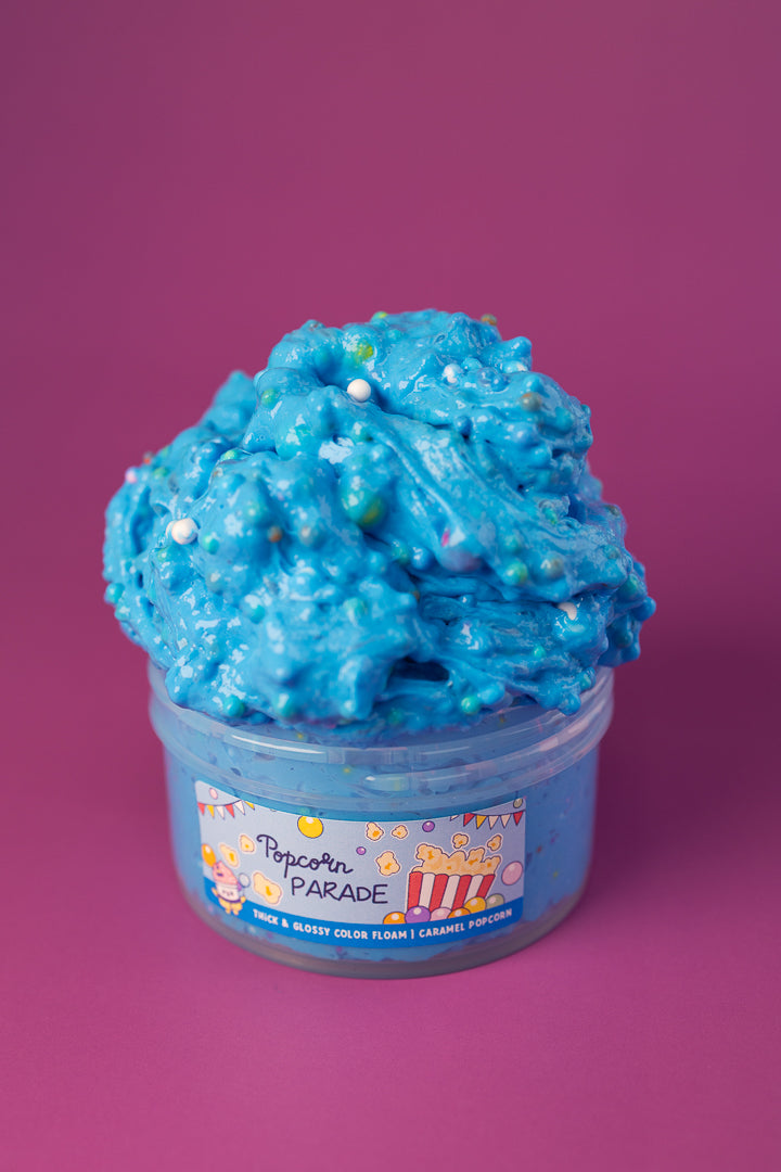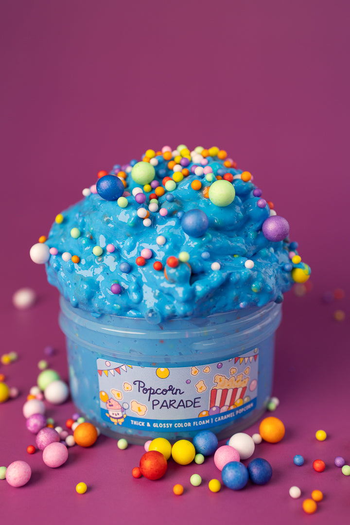This thick and glossy blue base is packed with colorful floam beads that bounce and crunch like a carnival crowd. Scented like sweet caramel popcorn straight from the fair, it’s a snack for your senses. Perfect for squishing, stretching, and putting on your own slime show, this one’s a main-stage in the Clowny Drop lineup!