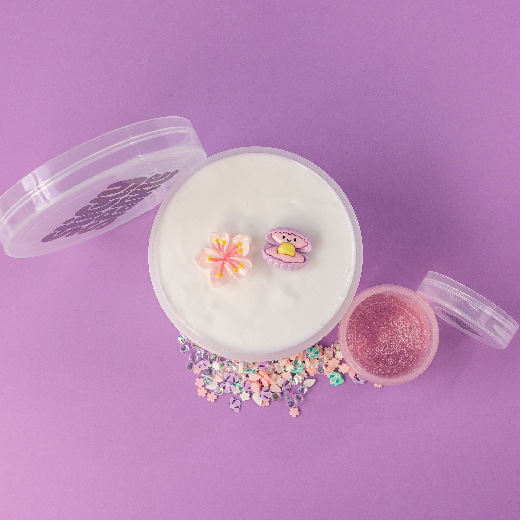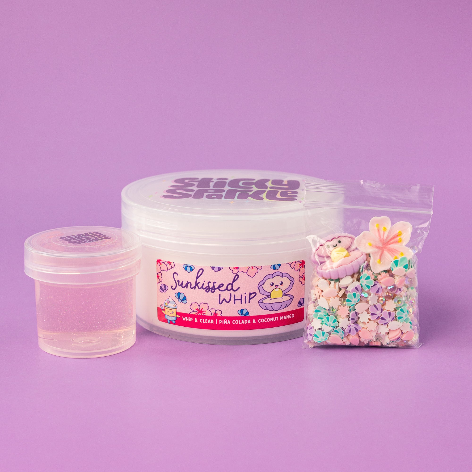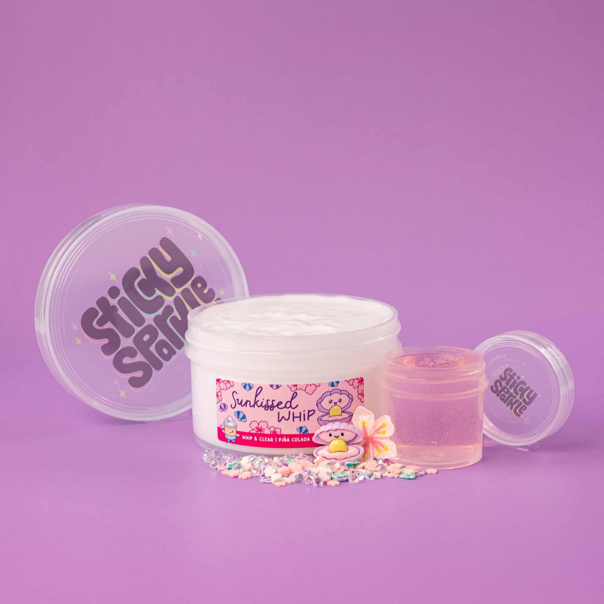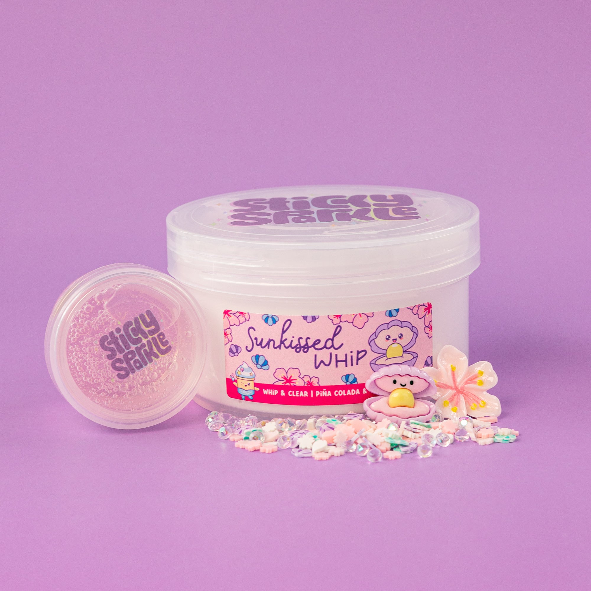 Like golden hour in a jar, Sunkissed Whip is a soft, dreamy white whipped slime scented with juicy mango and creamy piña colada. It comes topped with a swirl of clear pink slime (hello, beachy sunrise vibes) and the prettiest tropical charms to complete the look. It’s light, airy, and ridiculously satisfying to stretch, swirl, and snap.