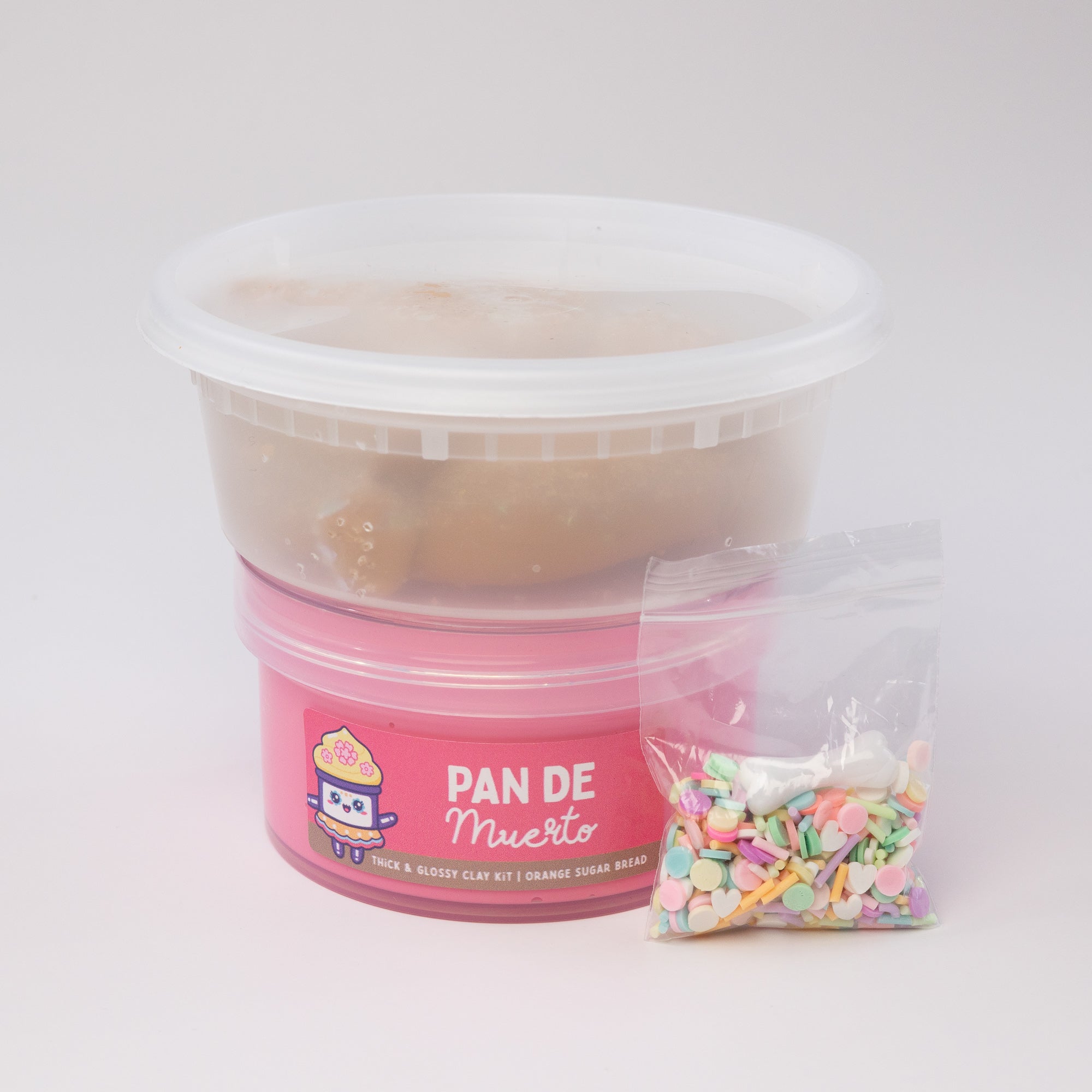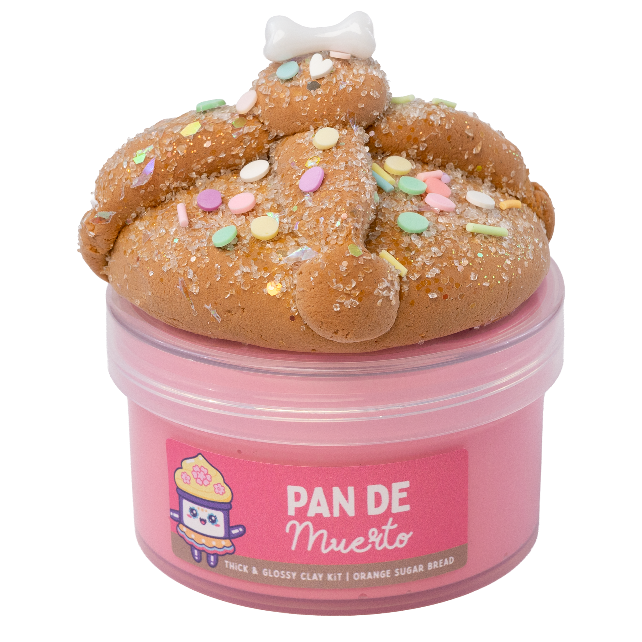 This slime features our thick & glossy clay kit texture, known for its ultra-smooth stretch, dense hold, and soft butter finish once mixed. The base is a vibrant pink, representing the bold, joyful colors used in ofrendas and traditional decorations. It’s paired with a soft clay “pan de muerto” topper, dusted with colorful sprinkles and a tiny bone charm, a sweet nod to the calaveras that symbolize remembrance and love.