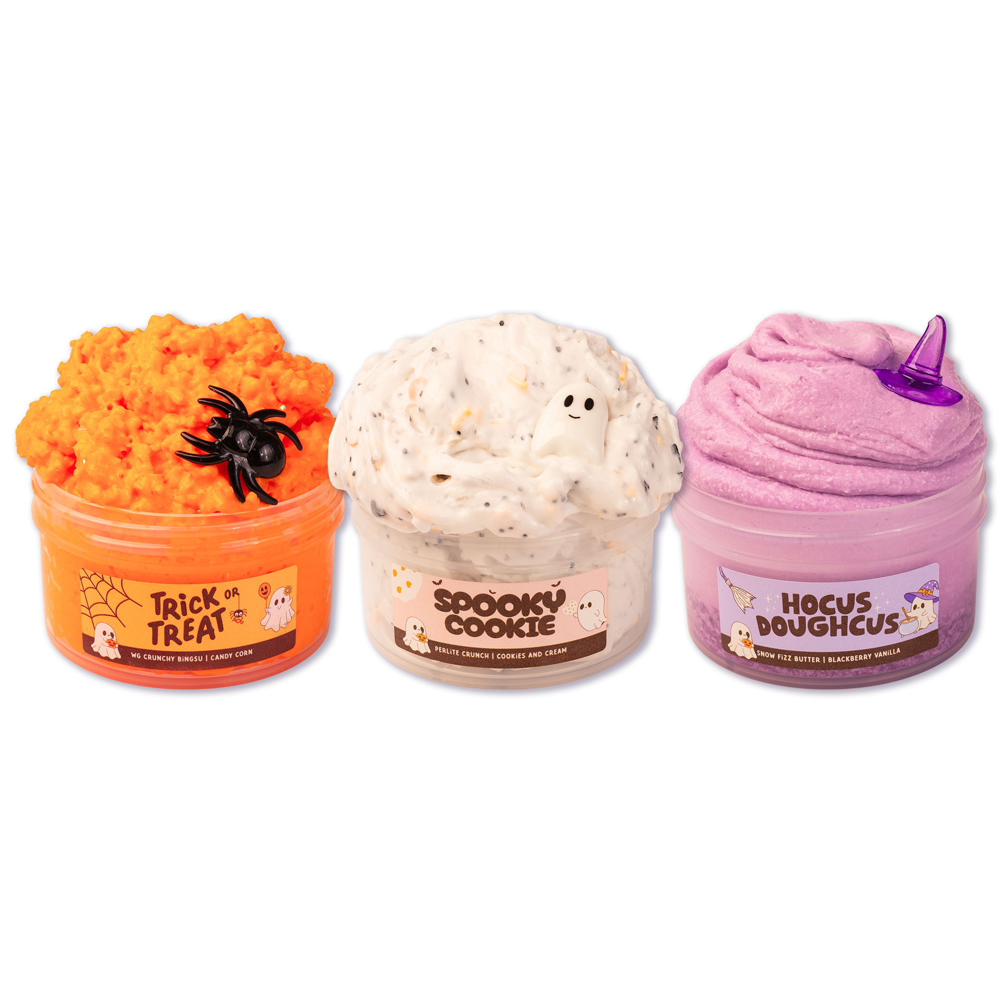 - Spooky Cookie – Perlite crunch slime, soft & textured with cookies & cream goodness, plus an adorable ghost charm.